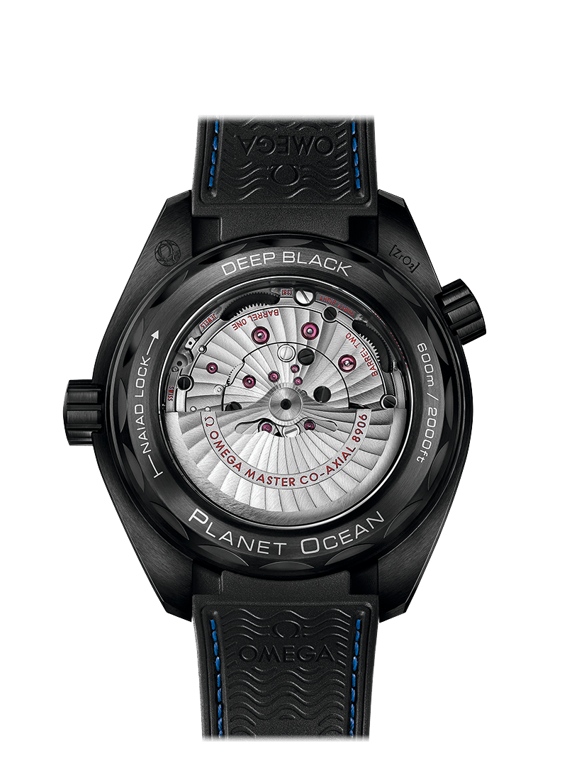 Il caso Matt è stato realizzato da un singolo blocco di ceramica e per la prima volta , la gomma è stata miscelata con la ceramica per creare una cornice unidirezionale unica. Questa innovazione colorata può essere vista coprendo i primi 15 minuti, mentre LiquidMetal&Trade; Completa il resto della scala delle immersioni. Sono state anche utilizzate iniezioni di gomma blu per colorare il logo Omega sul simbolo della valvola di fuga con corona e elio.